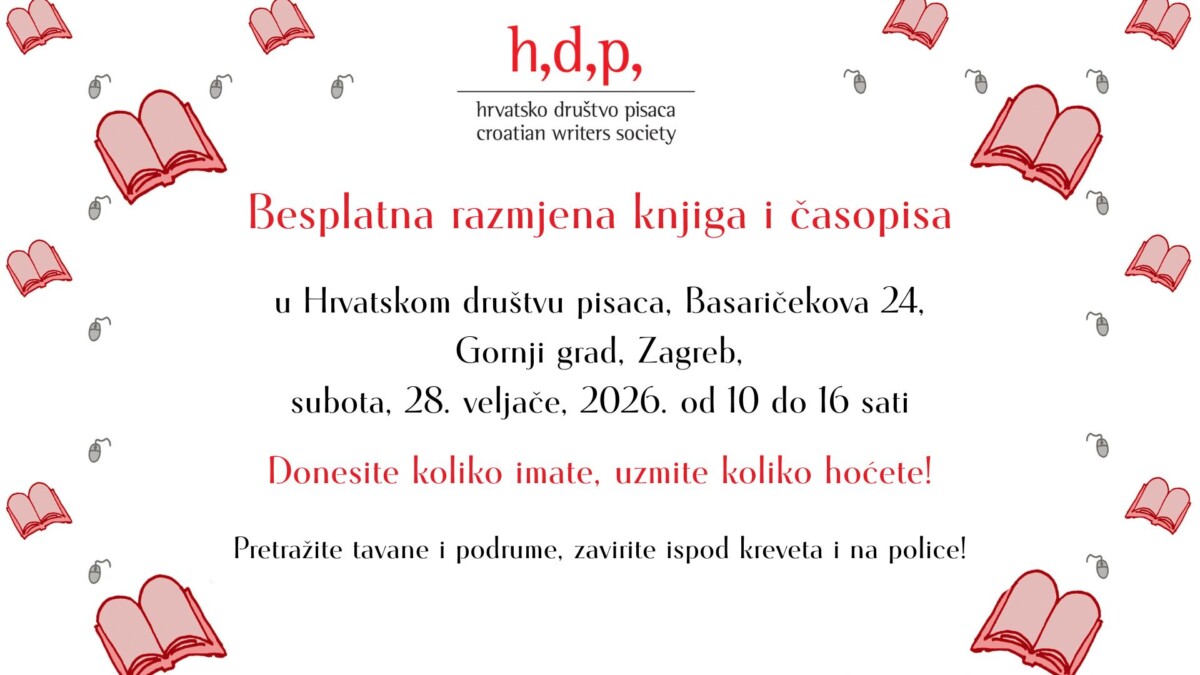 Besplatna razmjena knjiga i časopisa u Hrvatskom društvu pisaca, Basaričekova 24, Gornji grad, Zagreb, održat će se subota, 28. veljače, 2026. od 10 do 16 sati.